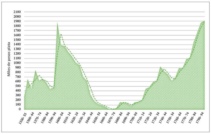 Las tendencias productivas del oro neogranadino aceptadas por la historiografía, recuperadas de las cartas cuentas de las cajas reales y de las casas de la moneda, aparecen representadas abajo, en el Gráfico 1, en quinquenios y miles de pesos de plata. Se muestran dos ciclos productivos y una depresión entre 1640 y 1680, año en que se inicia una lenta recuperación, con una tendencia al alza hasta finales del XVIII50. La producción del primer ciclo refleja que desde la década de 1640 desaparecen los reportes de oro del distrito de Santa Fe y reaparecen en cantidades mínimas en declaraciones tanto en las cajas reales como en la Casa de Moneda durante las dos últimas décadas del siglo XVII51; cabe recordar que las minas de Pamplona pertenecían al distrito de Santa Fe.