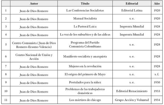 Romero identificó las necesidades propagandísticas y los reclamos de algunos militantes que extrañados indicaban que “el soviet de Bogotá” aún no había “editado un catecismo socialista para regalarlo profusamente por campos y ciudades; por los suburbios miserables y por las rancherías indígenas de nuestras sierras”55. Como respuesta a estos llamados, el dirigente socialista publicó el primer folleto de propaganda conocido como Las Conferencias Socialistas, que se imprimió luego de su intervención en el barrio de Las Cruces, en Bogotá. A partir de esta primera iniciativa, editó alrededor de once folletos con una variedad de temas, y a través de estos socialistas, comunistas y anarquistas se acercaron a algunas lecturas doctrinarias, análisis sociológicos e interpretaciones sobre la sociedad colombiana (tabla 1).