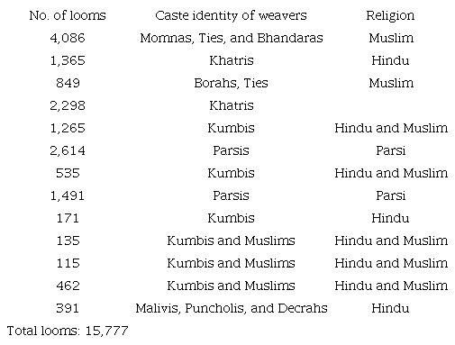 A distinguishing feature of textile production in Gujarat was its concentration in towns and urban centers, while in Bengal and southeastern India, it was scattered in suburban towns and villages. Major cities, such as Ahmadabad, Cambay, Broach, Baroda, and Surat, and suburban towns, like Ankleshwar, Dabhoi, Nediad, Dholka, Bardoli, Navsari, and Gandevi, were prominent centers of textile production.48 In the second half of the eighteenth century, while manufacturing in Cambay and Ahmadabad declined, Surat, along with its satellite towns of Bardoli, Navsari, and Gandevi, emerged as the largest textile producer in Gujarat and Western India, mainly because of the migration of weavers and artisans of Cambay, Ahmadabad, and other places to Surat. According to a 1795 report on textile production, Surat had 15,777 looms operated by weavers of different castes and communities (Table 2).49 In the absence of comparable data for an earlier period, it is impossible to determine the extent of growth of the textile industry in Surat. The figure, however, indicates a large concentration of weavers in the city and, therefore, the urban nature of the industry. Other factors, such as high local and foreign-especially European-demand, proximity with cotton-growing districts of Broach and Baroda, a large and autonomous merchant class, a stable money market with credit and exchange facilities, and a non-interventionist government, greatly contributed to the success of the industry in Surat. Surat was the headquarters of European companies in Western India and the home of numerous Gujarati and other Asian merchants and artisans, including weavers. The ensuing intersection between demand and supply within the city had some major implications for the structure and organization of the textile industry, modes and relations of production, and the functioning of the market.
