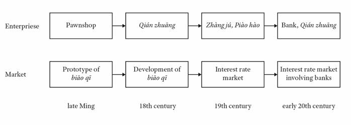 In the late 19th century, Western practices increasingly influenced the domestic financial sector. The greatest influence was the entry of new financial organizations, especially modern banks, which gradually gained a considerable market share from traditional financial organizations by the beginning of the 20th century. However, their competition was not only based on the survival of the fittest. On the one hand, modern banks recruited experts from traditional financial organizations, and their spatial distribution was closely correlated. On the other hand, and more importantly, traditional interest rate markets, including the inter-bank call loan markets in Shanghai and Hankow and the lending market based on biāo qī in Shanxi, continued to be active. Modern banks still needed to participate in these markets to conduct inter-bank transactions and make settlements, which were maintained until structural changes were brought about by the “Great Depression” (1929-1939) and other external shocks. Although the average size of traditional financial enterprises was smaller than that of modern banks, the scale and efficiency of capital allocation could still be greatly improved through the traditional inter-bank market. Some financial version of Coase’s theory of “firms substituting for market contracting” existed. Accordingly, Figure 1 summarizes the evolution of financial organizations in the Ming-Qing eras.