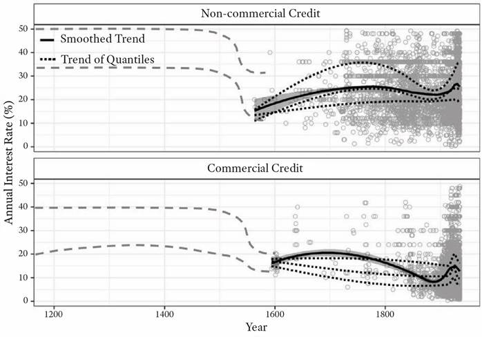 As to the situation after the 17th century, we have more systematic data to observe the changes in the distribution of interest rates, thanks to the uncovering of new historical materials in the past three decades, especially commercial documents. As shown in Figure 2, the interest rate level of ordinary lending after the 17th century converged to 20% p.a., which was lower than both the upper limit of the standard legal rate, equaling 3% per month or 36% p.a., and the typical level before mid-Ming times. However, instead of continuing the downward trend, the interest rate level was essentially flat or even rose slightly. In contrast, interest rates on commercial lending showed a decreasing trend in the long run. Its average level dropped from nearly 20% p.a. in the 17th century to a level slightly lower than 10% p.a. in the mid-late 19th century, and fluctuations appeared since then due to a turbulent environment and market fluctuations. For the trends of quantiles, the decline in the upper quartile (75%) of commercial borrowing rates was actually insignificant, while the decrease in the lower quartile (25%) was strongest. The downtrend of the lowest part of the interest rate precisely reflects the then existing limits in the evolution of the financial organization and technology, even though observations of this part are relatively scarce before the 19th century. This part represents the prime rates in different stages of financial evolution, and their divergence from the ordinary rates also mirrors that capitalist development was not absent given the economic changes that took place during the Ming-Qing periods.