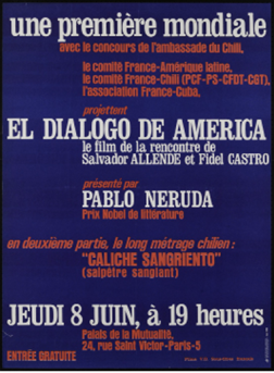 El Comité France-Chili constituye un ejemplo temprano de organizaciones de apoyo. Iniciado en 1971, en él se reunían representantes del Partido Socialista y del Partido Comunista Francés (pcf)80. Al tener como objetivo la promoción de la up, y contando con la ayuda de la embajada chilena en Francia, este comité organizó entre marzo y junio de 1972 dos grandes mítines en la sala de la Mutualité en París (actos que se ajustaban, por lo demás, con la firma del Programa Común de la izquierda parlamentaria). En el acto del 8 de junio se organizó el “estreno mundial” del documental El diálogo de América (Álvaro Covacevich, Chile Films/Sudamericana Films, 1972), cuya selección no fue anodina (Grafico 1)81. Se trató de una de las tres cintas realizadas sobre la visita de Fidel Castro a Chile en diciembre de 1971. A diferencia de otros dos documentales, De América soy hijo…Y a ella me debo (Santiago Álvarez, icaic, 1972) y Cuba, Cuba, Chile te saluda (Fernando Bellet y Douglas Hübner, Chile Films, 1972), este trabajo de Álvaro Covacevic contiene la única conversación filmada entre Allende y Castro82. Con la mediación del periodista Augusto Olivares, la cinta adquirió una dimensión oficial, pues proponía una perspectiva cercana al gobierno chileno, centrada más en la convergencia de luchas del continente por la independencia, antes que en sus estrategias revolucionarias. El acto en París contó con la participación de varios comités latinoamericanos, además de la presencia de diplomáticos y líderes de la izquierda francesa, lo que transformó el estreno en una celebración de la amistad continental, y más específicamente, de la amistad chileno-cubana. Fue este aspecto de la solidaridad entre procesos revolucionarios el que trató de elevarse a la categoría de ejemplo para el pueblo francés. Sin embargo, el discurso de presentación de la cinta, otorgado por el nobel de literatura y político chileno, Pablo Neruda, enfatizó en la independencia política de cada gobierno, con el fin de evitar las amalgamas entre la Vía Chilena al Socialismo y la vía cubana83.