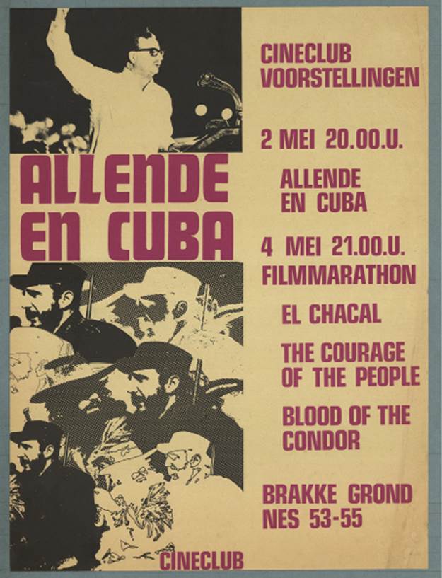 Otra muestra de la relación chileno-cubana, como punto referencial para difundir la situación de Chile, fueron las actividades que, en el contexto de los festejos asociados al día del trabajo en los Países Bajos, organizaron el Chili Komitee y la asociación Evert Vermeer (próxima al Partido Laborista, PvdA) durante mayo de 1973. Bajo el lema “Yo trabajo por Chile” (Ik werk voor Chili), una serie de actividades de difusión buscó sensibilizar acerca de las dificultades económicas del gobierno de Allende y contribuir a la recaudación de dinero85. Entre otras instancias se programó un ciclo de cine a cargo de Vrijhedsfilms, una asociación de distribución cinematográfica autónoma (creada en 1966) cuyo foco era la difusión de películas para centros barriales, educativos y organizaciones políticas. Consideradas como “arma de combate”, las películas disponibles en el cineclub cumplían con un lineamiento claramente antimperialista y anticolonial, favorable incluso a la vía armada. No es sorprendente que su catálogo contara con un número considerable de producciones del Tercer Mundo, en su mayoría latinoamericanas, procedentes del icaic86. Es por esto que, durante las actividades de mayo de 1973, el documental de Santiago Álvarez, De América soy hijo... y a ella me debo (1972), fue proyectado para ilustrar la realidad chilena a través de la trayectoria de Fidel Castro, quien, se dice, “asistía plenamente el proceso chileno”, puesto que Cuba no podía ni debía ser el único país socialista de América Latina (Grafico 2)87. El programa incluyó otras películas que aludían a una retórica de lucha y de insurrección (hablamos de Tupamaros y El coraje del pueblo, como lo muestra el Tabla 1). El chacal de Nahueltoro (1969) de Miguel Littín, fue el único filme chileno programado que se encontraba hasta entonces disponible en el catálogo del cineclub. Ya sea por la ausencia de películas procedentes de Chile o por la influencia del imaginario revolucionario cubano, la difusión del proceso up en este contexto de militancia holandesa pasó necesariamente por su vinculación con el régimen de Fidel Castro. Solo después del golpe de Estado de 1973, Vrijhedsfilms incorporó otras cintas sobre Chile en su catálogo, que lograron ser distribuidas por distintos comités y asociaciones en el marco de las campañas de solidaridad88.
