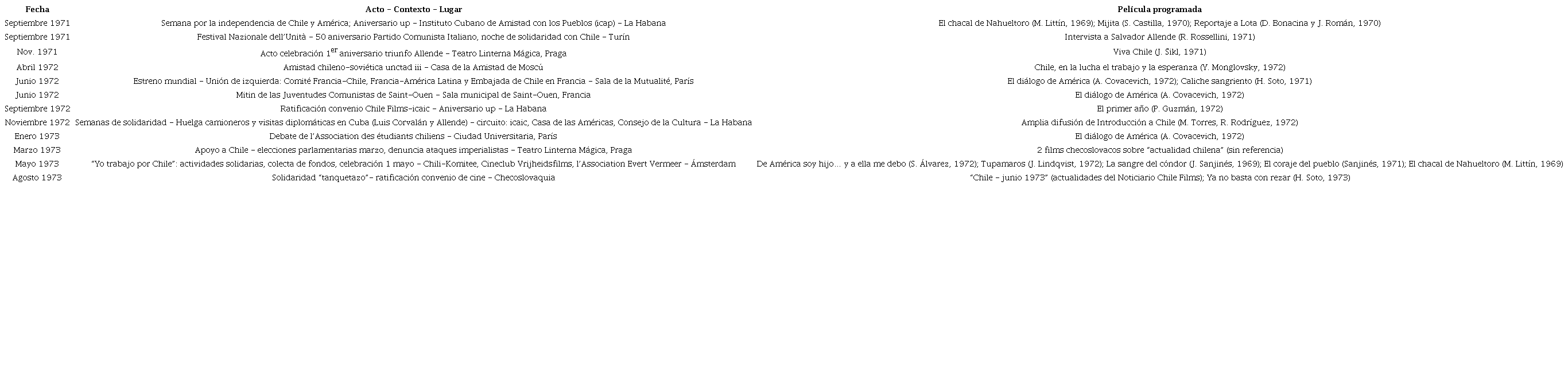 A pesar de la dispersión de instancias, en el Bloque Occidental también encontramos la huella de iniciativas tempranas de apoyo hacia Chile. Gestionadas por organizaciones de izquierda o de la sociedad civil, estas actividades contaron igualmente con la coordinación de las misiones diplomáticas chilenas. A menudo, la selección de las películas daba cuenta de imaginarios que trascendían el caso chileno, como lo indica el Tabla 1. En este primer momento de la solidaridad, cuando se buscaba ante todo popularizar la causa de la up, la estrategia mediática consistía en convocar referencias que, si bien parecían más familiares para los públicos europeos, arriesgaban producir visualmente una homologación de los procesos revolucionarios en América Latina. Esta “selección cinematográfica” respondió también a cuestiones prácticas, relacionadas con la ausencia de un repertorio de títulos sobre Chile lo suficientemente amplio como para diversificar la programación, y a problemas de distribución, puesto que ni las embajadas chilenas, ni las organizaciones políticas disponían de filmes suficientes.