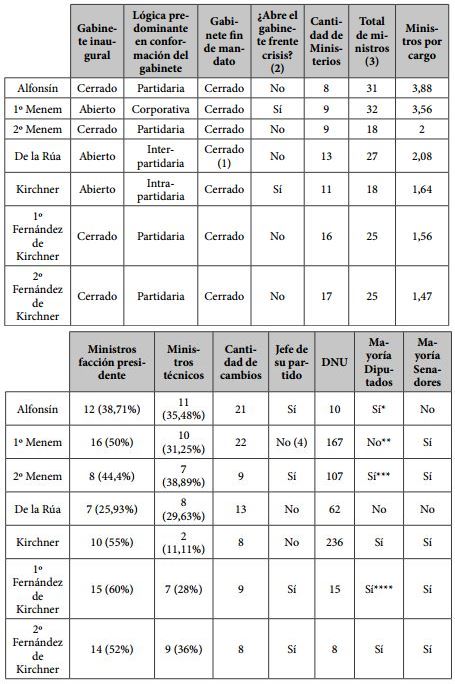 Alfonsín comienza con un gabinete cerrado pero a medida que se debilita por la crisis socioeconómica y su falta de recursos, lejos de privilegiar la apertura, continúa en la estrategia de clausura. De la Rúa representa el único intento de plasmar una coalición interpartidaria en el gabinete, no obstante, se desarma frente al primer conflicto. Fernández de Kirchner continúa con la estrategia de clausura emprendida por su esposo al final.