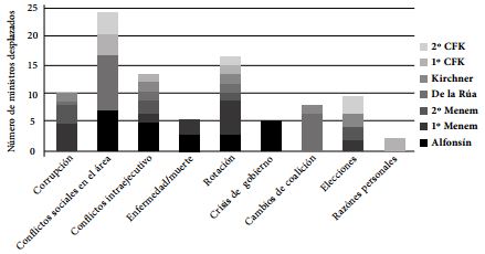 Tercero, los cambios responden a situaciones puntuales. Rara vez se dan cambios de varios ministros al mismo tiempo y por la misma razón. Las causantes de los cambios de ministros se observan en el cuadro 2. En primer lugar, un conflicto en el área (por ejemplo huelgas o conflictos gremiales en Trabajo, epidemias en Salud, crisis energéticas en Obras Públicas) promueve la mudanza. En segundo lugar, hay que diferenciar las destituciones de ministros de las rotaciones de los mismos. Ambas deben ser evaluadas de forma diferente, pues la rotación no responde a la inconformidad del presidente con un ministro sino a otro tipo de necesidad. En Argentina, ellas son utilizadas principalmente por Menem y Cristina Fernández. En tercer lugar, los conflictos intra-ejecutivos (una disputa entre ministros o con el propio presidente) son otra razón de cambio: las diferencias de dirigentes radicales históricos con el plan de Sourrouille, la agudización del conflicto entre las alas política y económica en el segundo período menemista y, por último, el desplazamiento de quienes intentaron mostrar autonomía con Kirchner. En cuarto lugar, a excepción del gobierno de Alfonsín y de Cristina Fernández, todas las gestiones sufrieron alteraciones por escándalos de corrupción.
