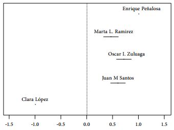 Al estimar este modelo descrito arriba, es necesario fijar la posición de dos de los candidatos, quienes sirven como referencia para definir la polaridad y el significado de cada unidad de la escala común en la que son ubicados. Para ello, se fija la posición de Enrique Peñalosa en 1 y la de Clara López en -1.6 Aunque estos valores son arbitrarios, esta representación numérica de la distancia percibida entre las posiciones de estos dos candidatos se usa como referencia para ubicar en una misma escala a los otros tres candidatos. Por tanto, la distancia numérica estimada entre Juan Manuel Santos y Óscar Iván Zuluaga, por ejemplo, estará puesta en términos de las dos unidades (entre -1 y 1) que representan las diferencias ideológicas entre los dos candidatos usados como referencia. Así mismo, valores cercanos a 1 indican posiciones más cercanas a las de Enrique Peñalosa, mientras que posiciones cercanas a -1 indican que dicho candidato tiene preferencias más afines a las de Clara López.