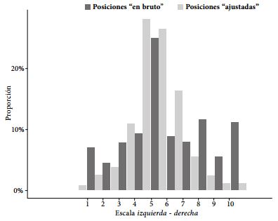 La siguiente figura presenta en negro la distribución de las respuestas “en bruto” y en gris la distribución de las posiciones “ajustadas” al tener en cuenta las diferencias en la forma como cada persona entiende las etiquetas ideológicas.7