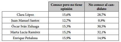 La tabla 1 presenta ambos porcentajes. Esta información revela que aunque el porcentaje de entrevistados que dicen conocer al candidato, pero no tiene una opinión, es similar (alrededor del 15%) para todos los candidatos, el porcentaje de quienes dicen no conocerlos es mucho más variable. Este porcentaje va de 0,9% en el caso de Juan Manuel Santos, hasta el 32,1% en el caso de Marta Lucía Ramírez. Aunque este alto nivel de respuestas faltantes impide hacer inferencias sobre la totalidad de la población colombiana, las entrevistas restantes representan la población que usa etiquetas ideológicas para describir el mundo político. Por tanto, al analizar sus respuestas podemos obtener lecciones importantes sobre la forma como este sector de la población percibe y representa el mundo en términos de polos ideológicos.