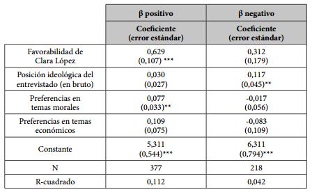 Estas diferencias reflejan ya no diferencias en las posiciones de los candidatos, sino divergencias en el uso de las etiquetas ideológicas, y son capturadas en el parámetro αi estimado anteriormente. Usándolo como variable dependiente, a continuación se presentan los resultados de dos modelos de regresión. En el primero se usan los entrevistados que identifican correctamente que Clara López tiene preferencias más hacia la izquierda que las de Enrique Peñalosa, y por tanto en el modelo tienen un parámetro βi positivo. En el segundo modelo se usan las entrevistas en las que Clara López es ubicada a la derecha de Enrique Peñalosa, y tienen un parámetro βi negativo.