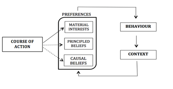 The theoretical framework proposes that these three components -material interests, causal beliefs, and principled beliefs- shape preferences by acting as the cognitive and material filters through which agents give meaning to their reality and visualize the desirability of given policies or courses of action (Blyth 2002; Schmidt 2008). The relationship amongst these components is dialectical -that is, they are always in contrast with one another- and through their interaction preferences are constructed to provide agents with guidelines for behaviour (Hay 2010).