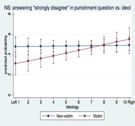 Moving on, Ideology#victim in the NS exhibits a negative association with the punishment and truth questions, and the TJ Index. In other words, ceteris paribus, a victim who considers herself left-wing is more likely to support courses of action that facilitate a peace agreement than a non-victim with the same ideological position. Figure 3 shows how these magnitudes affect probabilities of support conditional on ideology for some of the questions. For instance, after controlling for all other variables, the predicted probability of an extreme leftist victim (Victim=1 and Ideology=1) answering "strongly disagree" on the punishment question is 20% lower than that of an extreme leftist who is not a victim doing so.