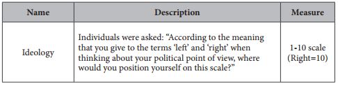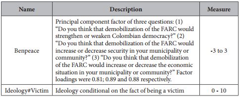 Ideology was measured as an individual's self-declared political ideology on a left- to-right scale from 1 to 10. Benpeace, or the potential benefits that an individual believes the demobilization of the FARC would bring to her municipality, was obtained through the latent factor in responses to three different questions. These refer to whether the individual thought that demobilization of the FARC would (1) increase or decrease security, (2) whether or not it would improve the economic situation in the respondent's municipality or community, and (3) whether it would strengthen or weaken Colombian democracy. As these questions were categorized inversely in the survey, lower values indicate greater perceived benefits. Lastly, the interaction term was constructed by multiplying Ideology with a dummy variable taking the value of 1 when the respondent was classified as a victim of the conflict (labelled ideology#victim).9Table 1 shows this information with greater clarity.