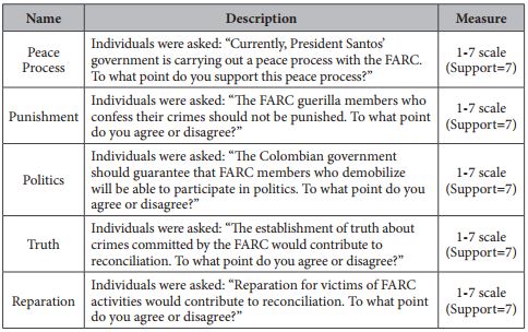 Following this train of thought, the article posits two research questions and corresponding hypotheses at theoretical and practical levels. To prove them it uses literature related to political preferences, along with quantitative data on Colombians' political attitudes from the 2013 LAPOP survey.4 Further qualitative data was retrieved through interviews of experts on the Colombian conflict and public opinion to provide a stronger basis for the findings.5