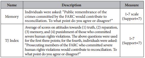 Seven variables were chosen as dependent variables to assess individual overall attitudes towards the current peace process and the policy arrangements that will stem from it. Six of these variables refer to questions asked in the survey, while the seventh one was constructed. The chosen topics range from support for the current peace process and concessions to the rebels to support for specific transitional justice measures such as truth-seeking. The constructed variable, the Transitional Justice (TJ) Index, focuses on the individual's support for transitional justice measures as a whole, involving matters of justice, memory, truth-seeking and reparation of victims. Table 2 explains these variables in greater detail.