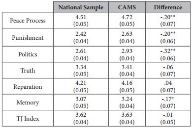 A second relevant pattern is that Ideology does indicate a clear-cut difference in determinants of preferences between the two samples. While the association between Ideology and the dependent variables is statistically significant in five out of the seven questions for the NS (peace process, politics, punishment, truth, and TJ Index), the same is true only for two questions in the CAMS (memory and TJ Index). Furthermore, while there is 95% and 99% confidence in this association in two of the questions (truth and politics) in the NS, it is never higher than 90% in the CAMS. In other words, whereas ideology is a significant predictor of individual support for most of the dependent variables in the NS, this is seldom the case in the CAMS. This clear distinction supports Proposition 2 of the analytical framework.