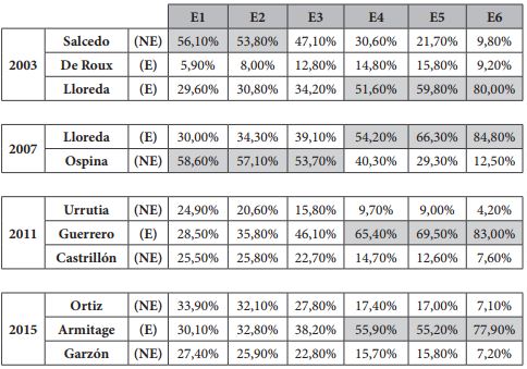 Es así como dadas las condiciones estructuralmente más favorables de las que gozan, basta para un candidato no élite que su segmento de candidaturas no esté fragmentado para ganar las elecciones. Este es, en esencia, el escenario existente en las elecciones de 2003 y 2007 que otorgó la victoria a Salcedo y a Ospina. Aunque en el primero de los casos, la derrota de Lloreda también puede entenderse por la competencia dentro del mismo segmento, establecida por la presencia de De Roux. De hecho, el pobre resultado de Salcedo en el estrato 4 hizo que su victoria dependiese también del alto nivel de fragmentación de las candidaturas élite.28