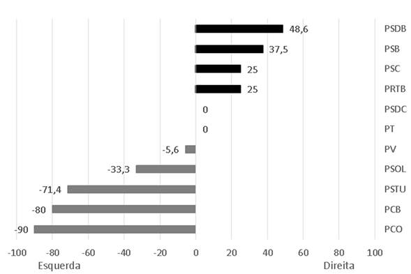 Particularmente, o Internacionalismo (positivo) compõe a escala esquerda-direita original elaborada pelo Manifesto Project. Todavia, de acordo com Tarouco (2008), há uma enorme discrepância quando os critérios elaborados por pesquisas que têm como objeto principal de análise partidos europeus são aplicados para classificar partidos políticos de outras regiões, como o Brasil. Desse modo, a inclusão de questões como o internacionalismo nessa escala faz pouco sentido, uma vez que o Brasil não passou pelos mesmos processos históricos revolucionários que moldaram as visões da política nos países europeus. Incluir o internacionalismo nessa escala resultaria, assim, em classificações no mínimo esdrúxulas (Madeira e Tarouco 2011). Esse entendimento pode ser corroborado ao analisarmos os resultados de nossa pesquisa. Os partidos de esquerda no Brasil tendem a defender mais questões de Internacionalismo (negativo), enquanto, na escala original do Manifesto Project, a versão positiva da categoria é entendida como uma questão de esquerda. Caso tivéssemos incluído o internacionalismo na nossa escala, o PSOL estaria mais próximo ao centro do que o PT, e o PSDC estaria posicionado equivocadamente à esquerda, inclusive estando à esquerda de PSOL, PT e PV. No campo da direita, não haveria mudanças significativas.