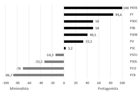 A partir das formulações de Ikenberry (2009) e Baum e Nau (2012), operacionalizamos dois conceitos (minimalista e protagonista) para analisar as ideias que os partidos defendem a respeito da atuação do Brasil no sistema internacional. Por minimalista, entendemos uma política externa alinhada com os países capitalistas centrais, em especial com os Estados Unidos, e caracterizada por uma participação periférica nas organizações internacionais; em contraste, por protagonista, uma política externa alinhada com países economicamente emergentes e destinada a aumentar o poder e a participação do Brasil nas organizações internacionais. Nesse sentido, uma atuação minimalista seria tipificada pela aparição de conteúdo classificado nas categorias Anti-imperialismo, Internacionalismo (negativo), Diplomacia (negativo) e Defesa nacional (negativo). De outro modo, uma atuação protagonista seria tipificada pelas categorias Inserção Internacional, Internacionalismo (positivo), Diplomacia (positivo) e Defesa nacional (positivo).
