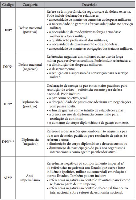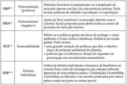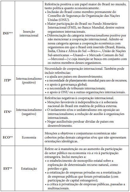 As categorias em que as sentenças foram classificadas foram definidas por meio de um modelo misto (Tabela 1), isto é, algumas delas foram definidas antes da exploração do material, e outras se formaram no decorrer dela. As que foram definidas a priori fazem parte do esquema de classificação do projeto Manifesto Research on Political Representation (MARPOR), grupo de pesquisa sediado em Berlim que se dedica à análise de manifestos partidários. Mas, na medida em que o conjunto de categorias do domínio relações exteriores desse método foi insuficiente para lidar com todas as questões de política externa, bem como para tratar das especificidades da política externa brasileira, algumas categorias foram adaptadas, e outras criadas com essa finalidade. As categorias utilizadas neste estudo podem ser consultadas no quadro abaixo.