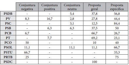 Os partidos que mais dedicaram espaço (medido em termos de unidade de registro) à política externa em seus manifestos, em números absolutos, foram PSDB (37), PV (36) e PSC (32). Em seguida, vieram PSB (16), PCB (15), PT (13), PCO (10), PSOL (9), PSTU (7), PRTB (4) e PSDC (2). As classificações dessas unidades revelou que a maioria dos partidos apresenta mais propostas do que análise conjuntural. As exceções são PCO (apenas 50% das unidades eram propostas) e PSTU (apenas 33,7% de suas unidades eram propostas). O PSC foi o partido que mais apresentou, em termos percentuais, propostas específicas. Por outro lado, o PSTU foi o partido que mais apresentou análises conjunturais (66,7%), as quais se caracterizam unanimemente por sua abordagem negativa. O PV (16,7%) superou o PT (7,7%) em termos de análise de conjuntura positiva, e o PSOL apresentou mais análises conjunturais neutras que os demais partidos. Os dados completos dessa análise encontram-se na tabela 2.