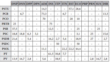 No que se refere ao posicionamento dos partidos na escala esquerda-direita, percebemos que há muita similaridade entre o que os nossos resultados apresentaram e a forma na qual os partidos são geralmente classificados pela literatura quando esta não isola uma temática em particular, o que pode sugerir uma ligação entre o que os partidos defendem na política interna e na política externa. A respeito da escala minimalista-protagonista, vimos que os partidos geralmente classificados como pertencentes à extrema-esquerda pelos especialistas foram os únicos a se posicionarem na direção de uma política externa minimalista. Já os partidos que defenderam uma política externa protagonista se localizam ao longo de quase todo o espaço ideológico. PCB, PV, PT e PSDB foram mais específicos quanto ao que entendem sobre o papel do Brasil nas organizações internacionais e nas parcerias estratégicas. Sobre o primeiro aspecto, PCB e PV sugerem a criação de uma nova organização internacional de nações em um processo liderado pelo Brasil. PV, PSDB e PT defendem também a democratização das instâncias decisórias da ONU, inclusive do seu Conselho de Segurança. Ademais, o PT, particularmente, vê como necessária uma reforma no FMI e no Banco Mundial para refletir a atual correlação de forças global.