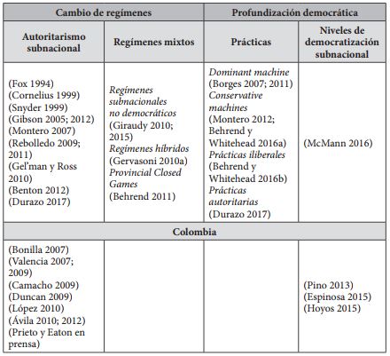 En la tabla 1 se evidencia que las investigaciones que se enmarcan en el grupo de "cambio de regímenes" han utilizado una estrategia de clasificación conceptual que retoma el estudio de la política subnacional desde los conceptos que se desarrollaron para clasificar los regímenes nacionales. En esta tendencia se pueden identificar dos subgrupos. En autoritarismo subnacional, las investigaciones clasifican de forma dicotómica las variaciones del régimen entre unidades subnacionales democráticas y autoritarias. Los principales problemas de esta clasificación han sido la dificultad para argumentar que dentro de un Estado democrático se puede consolidar una región completamente autoritaria e invisibilizar regiones que, a pesar de tener prácticas autoritarias, no pueden ser consideradas completamente como autoritarismos subnacionales. El segundo grupo responde a estas críticas y con base en la literatura sobre regímenes híbridos (Diamond 2009; Levitsky y Way 2002) plantea utilizar conceptos como regímenes híbridos o no democráticos. Con el empleo de estos conceptos se busca superar la perspectiva dicotómica (autoritarismo-democracia) de los primeros estudios y analizar la democracia subnacional por medio de un contínuum conceptual entre democracia y autoritarismo que describe e identifica los diversos regímenes subnacionales con características autoritarias y democráticas.