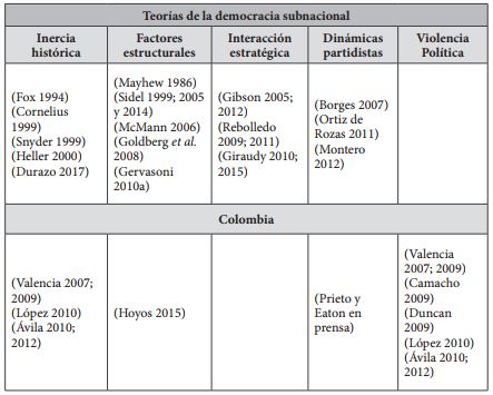 El tabla 2 organiza las teorías que ha utilizado la literatura para explicar las variaciones de la democracia subnacional. Esta clasificación se basa en el apartado 1.1.2, en el que se discuten las distintas teorías. No sobra reiterar que este es un ejercicio esquemático que prioriza el principal elemento explicativo utilizado por los autores, sin negar que la mayoría de los autores articulan distintas variables independientes en sus explicaciones teóricas.