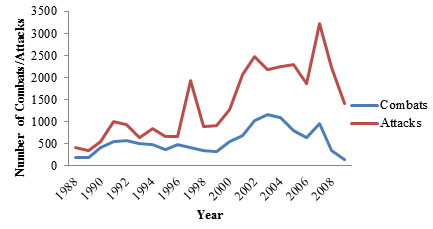 The Colombian conflict is considered to be a conflict of long duration and variable intensity. Two violent actors have been the major players behind the conflict: the guerrilla groups and the paramilitary groups. These illegal actors went through a period of re-organization between 1991 and 1994 because of a major cut-back in available resources due to the end of the Cold War. This re-organization led to changes in their operative and financial structures. More specifically, during the first half of the nineties these illegal groups expanded their territorial presence throughout the country. However, according to Restrepo, Spagat and Vargas (2006), the violence did not increase at that time. It was not until the year 1996 that the dynamic of the conflict started to change significantly, meaning that the re-organization that took place during the first half of the nineties had a lagged effect on this dynamic. According to these authors, there was an important increment in the intensity of conflict and in the frequency of combats and attacks that took place during that period (Graph 1). The re-organization period revitalized these illegal groups, allowing them to grow and gain power.