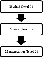 Given the limitations of the estimation strategies outlined above and the structure of our dataset, we used a three-level multilevel model for the analysis (Graph 3). In multilevel analysis the multilevel nature of data is taken into consideration when doing the statistical modeling by simultaneously modeling variables at different levels without resorting to aggrega tion or disaggregation of the dataset (Garson 2012). As Garson (2012) highlights, by aggregating and disaggregating data used in regression models there is a risk of running into an ecological fallacy -i.e. what is true at one level need not necessarily be true at another level. The advantage of using multilevel models is that these models handle data where observations are not independent, and by doing so, they are correctly modeling correlated errors. Additionally, it is possible to get an estimate of between-group variance. As Goldstein (2011) highlights, if neither students nor schools are modeled simultaneously, it is impossible to study the extent to which school and student characteristics interact to influence the response measurement or measurements.
