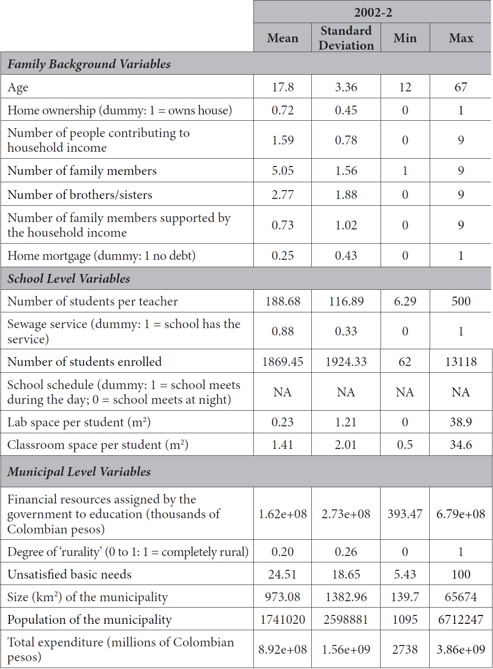 Table 2 summarizes all the other relevant familial, school, and municipal level variables, including the minimum and maximum values, and the mean and standard deviation.