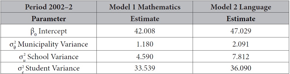 For the second semester of 2002 (Table 3), the overall mean score in mathematics (β0) is estimated to be 42.008, and the variance 39.309. The variance can be decomposed into variance among municipalities (1.180), variance among schools (4.590) and variance among students (33.539). In terms of the VPC statistic, the results show that 3% of the variation in the mathematics test lies among municipalities, 11.7% lies among schools and 85.3% lies among students. In this case, the results obtained from the LR test also show that the three-level model is preferred to a single-level model ( 𝜒 2 2 =42598.64, 𝑝<0.000), to the two-level students-within-municipality model ( 𝜒 1 2 =28446.248, 𝑝<0.001) and the two-level students-within-schools model ( 𝜒 1 2 =1034.263, 𝑝<0.001). Given these results, a three-level multilevel model should be used to analyze this dataset instead of a two-level or single-level model. For that same time period, in the case of the language exam dataset we can also justify the use of a three-level multilevel model. The overall mean score on the language exam (β0) is estimated to be 47.029, and the total variance 45.993. The variance can be decomposed into variance among municipalities (2.091), variance among schools (7.812) and variance among students (36.090). The VPC statistic shows that 4.5% of the variation in the language test lies among municipalities, 16.9% among schools, and 78.6% among students. The LR test shows that for the language exam the three-level model is preferred to a single-level model ( 𝜒 2 2 =63489.74, 𝑝<0.000), to a two-level students-within-municipality model ( 𝜒 1 2 =42128.7, 𝑝<0.001) and to a two-level students-within-schools model ( 𝜒 1 2 =1301.5, 𝑝<0.001). Given these results, the use of a three-level multilevel model is justified.