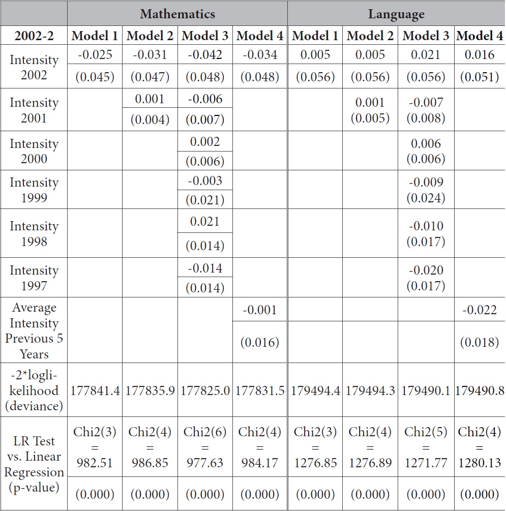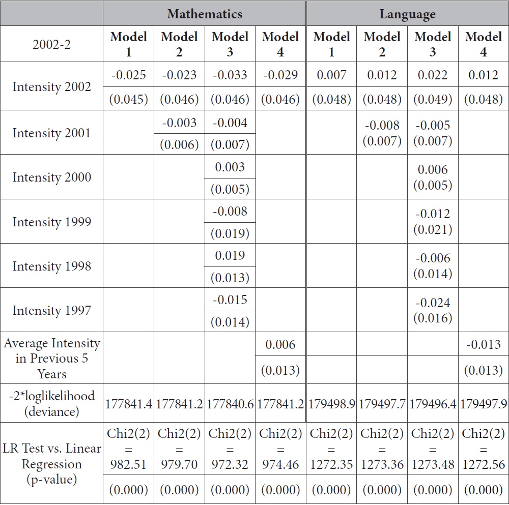 The results for mathematics (Table 4) show that the variable that indicates the intensity of conflict is not significant in any of the specifications considered. This is true for both the contemporary measurement of intensity and for the lagged measurements of intensity of conflict. Just as in the case of the mathematics examination, the results of the language examination show that the variable that indicates the intensity of conflict is not significant in any of the specifications considered. This is true for both the contemporary measurement of intensity and for the lagged measurements of intensity of conflict.3