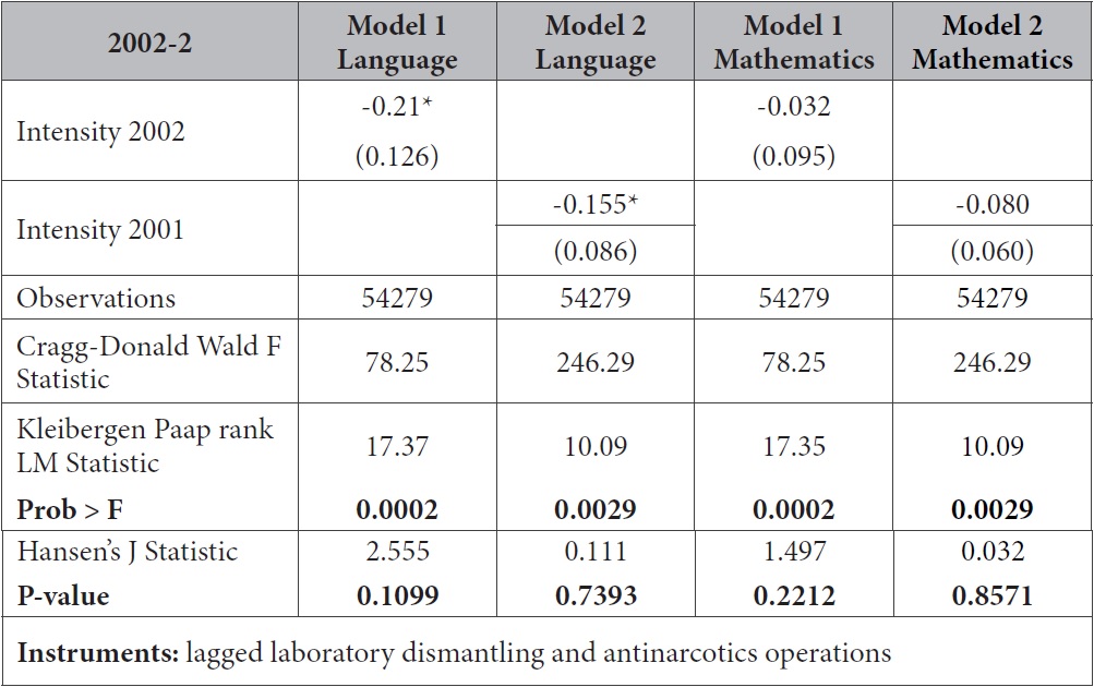 Table 6 shows the results of the instrumental variables approach used to quantify the impact of the intensity of the conflict on the results in the language and mathematics exit examinations.5 We tested two different specifications. In the first specification (model 1) we include all the control variables and we instrumentalise the intensity of the conflict in the year under analysis6 using the lagged measure (t-1) of laboratory dismantling and antinarcotics operations. In the second specification (model 2) we include all the control variables and we instrumentalise the intensity of the conflict in the year before the students took the national examination using the lagged measurement (t-1) of laboratory dismantling and antinarcotics operations.