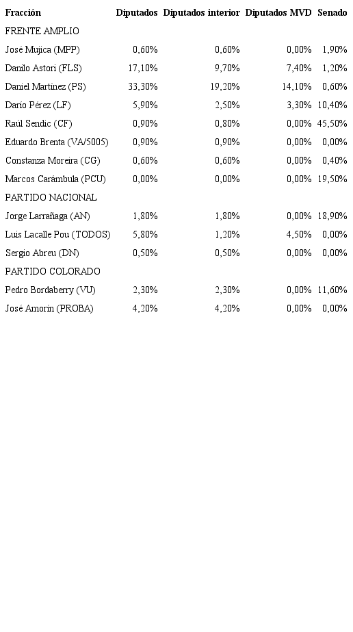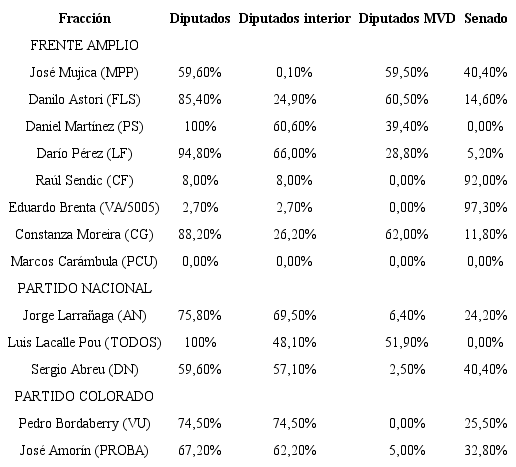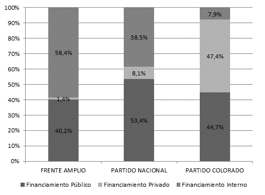 Un segundo nivel de análisis refiere a la forma en que se estructuran las fracciones dentro de los partidos. Esto se puede apreciar observando cuán descentralizadas o centralizadas son su recolección de ingresos (en especial, los de origen privado) y su ejecución de gastos, y cuán importante es el financiamiento interno. Como se mencionó antes, el sistema de partidos uruguayos está altamente institucionalizado y cuenta con bajos niveles de volatilidad electoral. Sin embargo, a nivel intrapartidario existe mayor flexibilidad, y los votantes sí cambian de fracciones de una elección a otra. Por tanto, los efectos del financiamiento de campañas en la interna de los partidos se ven reforzados, ya que inciden notoriamente en la competencia entre fracciones.