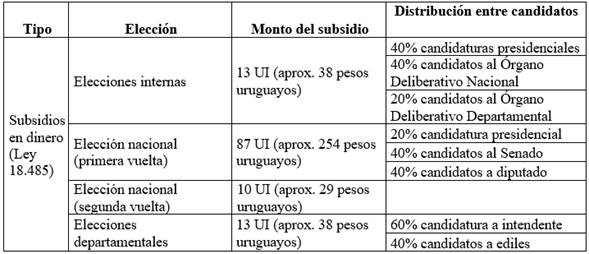 Uruguay tiene uno de los sistemas de subsidios públicos más viejos y generosos del mundo (Casas 2005). Desde 1928 hasta 2004, para cada elección, el Parlamento votaba una ley que fijaba el monto del subsidio a pagar por voto a los partidos y la forma en que se distribuiría entre las distintas candidaturas (presidente y vicepresidente, senadores y diputados en las elecciones nacionales e intendentes y ediles en las elecciones departamentales). La Ley 18.485 de 2009 estableció este subsidio de manera definitiva (ver la tabla 1).