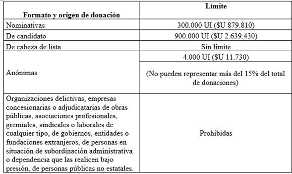 En consonancia con los estándares internacionales, la ley instaura límites a las donaciones privadas en términos de sus montos, orígenes y formatos. La normativa establece como principio general que las donaciones a los candidatos sean nominativas, es decir, que se declaren el nombre del donante y el monto que donó. Estas donaciones no pueden exceder las 300.000 UI ($U 879.810) (sean de personas físicas o jurídicas). Cuando el aporte es realizado por un candidato, debe ser menor a 900.000 UI ($U 2.639.430), mientras que las donaciones de los primeros titulares de las listas no están limitadas. Adicionalmente, aunque la norma prevé la posibilidad de que los partidos puedan recibir donaciones anónimas (aquellas en las que se declaran los montos pero no se declara el donante), cada una no puede superar las 4.000 UI ($U 11.730,10 y a su vez la suma de donaciones anónimas no puede ser mayor al 15% del total de ingresos que se declaran en la rendición de cuentas “anual” (ver la tabla 2).