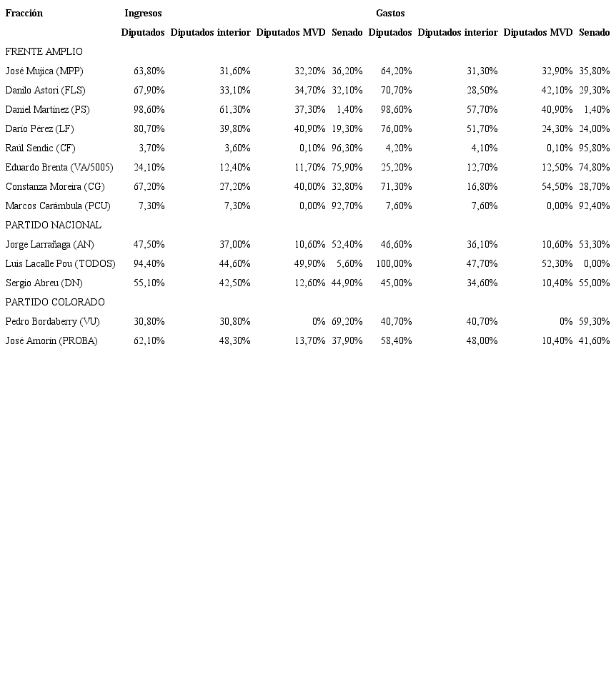 Con respecto a la centralización de ingresos y gastos se pueden distinguir fracciones de alta centralización de recursos, como las encabezadas por Raúl Sendic (CF-FA), Eduardo Brenta (VA/5005-FA), Marcos Carámbula (PCU-FA) y Pedro Bordaberry (VU-PC). En todas ellas el porcentaje de los ingresos y gastos de la fracción se concentra en la lista de senadores que es expresión de la fracción a nivel nacional (más del 70%). En niveles intermedios de centralización encontramos a las fracciones del PN encabezadas por Jorge Larrañaga (AN-PN) y Sergio Abreu (DN-PN). Es de notar también que todas las fracciones del FA (excepto la fracción encabezada por Daniel Martínez [PS]) concentran más del 60% de sus ingresos y ejecución de gasto en la lista de diputados de Montevideo y la lista de senadores. Las fracciones del FA, como es de esperar, muestran en promedio una pauta de recaudación de fondos y ejecución de gasto más centralizada que las de los partidos tradicionales (PN y PC) (ver la tabla 4).