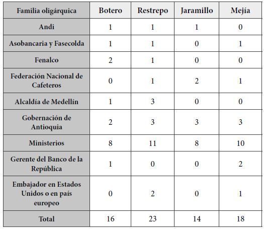 La formación de la oligarquía en Medellín se remonta a finales del siglo XIX, cuando familias dedicadas al comercio como los Restrepo, los Jaramillo, los Echavarría, los Botero y los Mejía diversificaron su portafolio de negocios al expandirse a la industria de textiles y manufactura para surtir el mercado interno que se había formado por los minifundios cafeteros (Botero 1984). Su éxito fue impresionante, pues durante las primeras décadas del siglo XX, el sector industrial antioqueño fue el que más aportó en este rubro al PIB del país (Brew 1977). El ascenso económico fue acompañado de un proceso de construcción de una hegemonía social y política. Los directivos de las principales industrias no sólo ocupaban la presidencia de los gremios más influyentes del país, sino que también detentaron de manera rotativa los cargos públicos del nivel subnacional y nacional. Fueron recurrentemente nombrados en ministerios, embajadas y agencias encargadas del manejo de la política económica (ver la tabla 1).