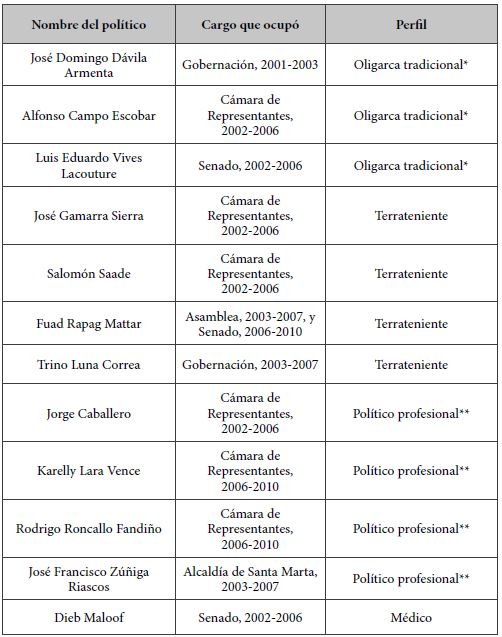 En términos porcentuales, el Bloque Norte apoyó en los principales cargos de elección popular de la región -como Congreso, gobernación del Magdalena y alcaldía de Santa Marta- a terratenientes ganaderos (38,4%), políticos profesionales (30,7%), oligarcas tradicionales en declive (23%) y políticos emergentes (7,9%). Es decir, los paramilitares se aliaron con actores de orígenes y estatus diferentes.41 Jorge 40 tuvo que negociar con sectores sociales, políticos y económicos disímiles para poder impulsar su proyecto de gobierno paramilitar llamado “Movimiento Provincia Unida”. No hubo, en consecuencia, una oligarquía mafiosa/emergente como tal que reemplazara a otra sino un reacomodamiento de sectores tradicionales frente a la irrupción de nuevos políticos, narcotraficantes y ejércitos privados, y una mayor participación en el Congreso de los latifundistas provenientes de otros municipios. Así mismo, hubo familias oligárquicas que se opusieron a las aspiraciones de poder político de los paramilitares: los denunciaron públicamente (Alfredo Escobar Araújo), compitieron con sus aliados (Sergio Díaz-Granados) y sirvieron como testigos para condenar las alianzas parapolíticas (José Joaquín Vives).