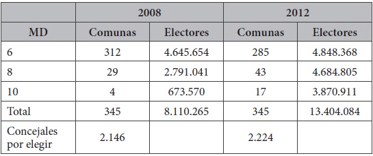 En las elecciones locales de 2008 —con voto obligatorio— la participación electoral alcanzó el 58%, tomando como base la población en edad de votar. Mientras que en la elección de concejales de 2012 —con voto voluntario— la participación electoral bajó a cerca del 43%. En estas elecciones locales se eligieron alcaldes y concejales. Los alcaldes se eligen por un sistema de mayoría relativa. Los concejales, autoridades que acompañan la administración del alcalde, se eligen mediante un sistema de representación proporcional con fórmula d’Hondt en distritos —comunas—, que reparte 6, 8 o 10 escaños. Ambos duran cuatro años en el ejercicio del cargo. La tabla 1 reporta el número de comunas, según la magnitud de distrito y el número de potenciales electores. Si en 2008 había más de 8 millones de electores, en 2012 la cifra supera los 13 millones. Esta diferencia responde al cambio de régimen electoral. Hasta 2009 los electores se inscribían voluntariamente en los registros electorales y el voto era obligatorio. Desde 2012, todos los ciudadanos de 18 años o más quedan automáticamente inscritos en los registros electorales y el voto es voluntario.