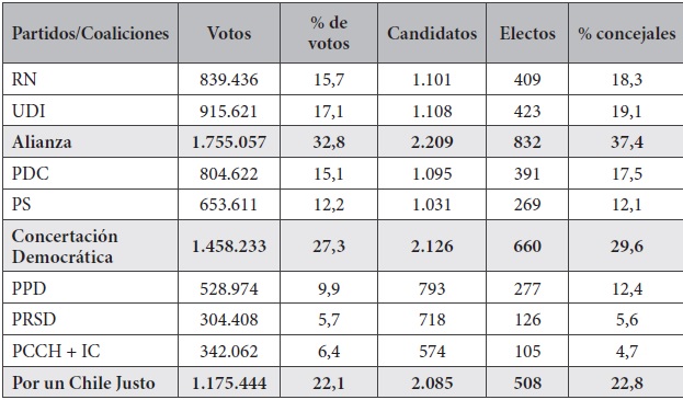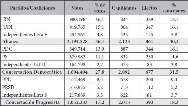 Los resultados de las elecciones de 2008 y 2012 se muestran en las tablas 2 y 3. En ambos comicios, la Concertación compitió con dos listas. Una se denominó Concertación Democrática —integrada por el PS y el PDC—, y otra, Concertación Progresista, integrada por el PPD y el PRSD. La Concertación Democrática logró el 27,8%, y la Concertación Progresista, el 17,2%. Entre ambas, eligieron a casi la mitad de los concejales. La Alianza, en tanto, obtuvo un 36,1% y eligió al 40% de los concejales.