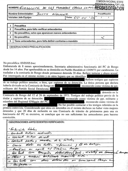 El proceso de calificación involucraba una ficha de ingreso y una entrevista que indagaban en los recintos de detención circunstancias y agentes represivos, además de la descripción de la tortura. De esta forma, se creó una carpeta para cada declarante, que incluía la ficha de ingreso, antecedentes entregados por ellos, y otros provenientes de organismos de derechos humanos, además de la ficha calificatoria e información que pudiese surgir de terceros. En la entrevista los profesionales informaban del mandato de la comisión de resguardar la confidencialidad de los datos entregados, lo que incluía la prohibición de divulgar parcial o totalmente dicha información. Luego se analizaba la carpeta, se triangulaba con otras fuentes y se calificaba el caso.