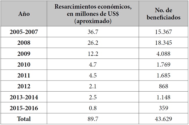 En 2010 se registraron 70.435 víctimas, se restituyeron 924 viviendas, con resarcimientos económicos por US$4.7 millones a favor de 1.769 personas. En 2011 se entregaron 1.137 viviendas y resarcimientos económicos por US$4.5 millones a 1.685 víctimas. En 2012 se presentaron resarcimientos económicos a 868 beneficiarios, por US$2.1 millones, aproximadamente (PNR 2012). En el período 2013-2014 se beneficiaron 1.148 personas con reparaciones económicas, por US$2.5 millones (PNR 2014). Entre 2015 y 2016 se beneficiaron 359 personas a través de transferencias condicionadas para restitución de viviendas, y 11 con resarcimientos económicos, sin incluir información sobre montos de dinero asignados, en uno y otro caso (PNR 2016) (ver la tabla 1).19