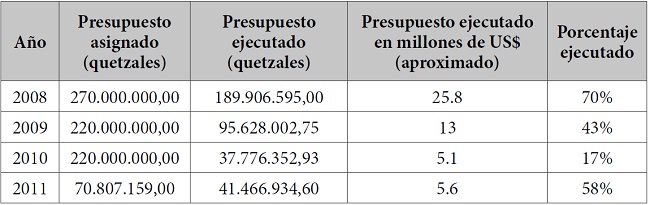 Mediante el Decreto No. 28 de 2004 el Congreso enalteció la actuación de las PAC y otorgó un “beneficio pecuniario como aporte de capital, por la actividad cívica desarrollada durante el conflicto armado” (artículo 2, Congreso de Guatemala 2004), correspondiente aproximadamente a US$712 para cada uno de sus exintegrantes. Este decreto fue declarado inconstitucional en 2005, por infringir normatividad sobre erogaciones presupuestarias (Corte de Constitucionalidad de Guatemala 2005). Ya en 2004 se había declarado la inconstitucionalidad del Acuerdo Gubernativo 566-2003, por falta de competencia del Ejecutivo para ordenar dicho gasto (Corte de Constitucionalidad de Guatemala 2004). En dicha oportunidad la Corte llamó la atención sobre la inconveniencia de otorgar sumas de dinero a los ex-PAC, abogando por “otras formas de resarcimiento de violaciones de los derechos humanos”, lo que llevó al presidente de la época a crear un programa para el otorgamiento de beneficios a favor de los ex-PAC, que, según Impunity Watch (2008), a 2007 superaban los otorgados a las propias víctimas.