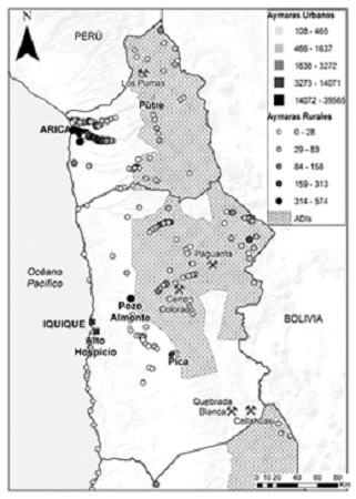 De esta forma, el Estado ha producido una nueva geografía aimara, a través de la aplicación de la política pública indígena: por una parte, ha aumentado el número de comunidades y asociaciones indígenas que conectan el territorio originario del altiplano y la precordillera con la población indígena que vive en zonas urbanas, como Iquique y Alto Hospicio. Por otra parte, se reconoce a las comunidades como organizaciones que tienen presencia territorial y que demandan el control de la tierra y el agua, fuertemente presionadas por el crecimiento urbano y el boom minero. Por último, se crean las ADI como forma de reconocer un territorio para la población indígena, donde se focalizan recursos para mejorar la calidad de vida de las comunidades y, al mismo tiempo, la sustentabilidad del territorio. Como muestra la figura 1, la mayor cantidad de población que se autoidentifica como aimara no vive en las ADI rurales y precordilleranas, sino en las zonas urbanas costeras. Esto nos parece un hecho central, dado que el espacio de reproducción de la cultura aimara hoy está anclado con fuerza en las ciudades, pero siempre con referencia a la zona andina, donde está el territorio con el que tienen un lazo afectivo y religioso.