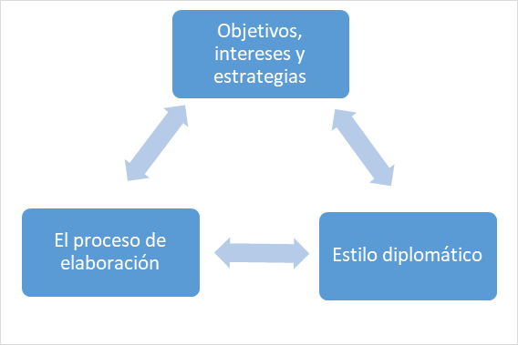 En la segunda dimensión, en el proceso de elaboración de la política exterior, entra en juego el “cómo, quién (o quiénes)” la implementan (Lasagna 1996, 58); o sea, el paso a paso de la toma de decisiones y su sistema burocrático. La tercera dimensión, que de cierta manera retoma el quién de la segunda, recae en el estilo diplomático. Esta forma absorbe la personalidad del líder, además de los “valores y perspectivas ideológicas de los encargados de implementarla, la tradición diplomática del país y los valores o normas no escritas del comportamiento internacional”.