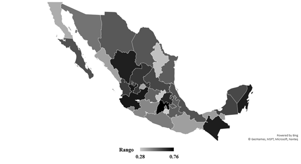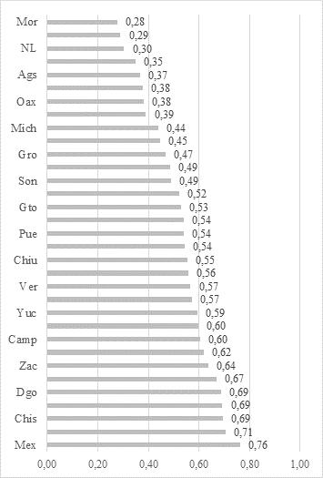 Los datos nos señalan que la brecha entre el estado con menor (Morelos) y mayor poder del gobernador (estado de México) es de 0,48 lo cual nos indica una variabilidad por destacar, al menos entre los casos extremos del índice. No obstante, la media es de 0,52 es decir, hay cierto equilibrio entre el número de estados con mayor y menor poder del gobernador. Destacan las entidades de Morelos y Querétaro, por estar debajo de 0,30 y los estados de Jalisco y México, que sobrepasan el 0,70.