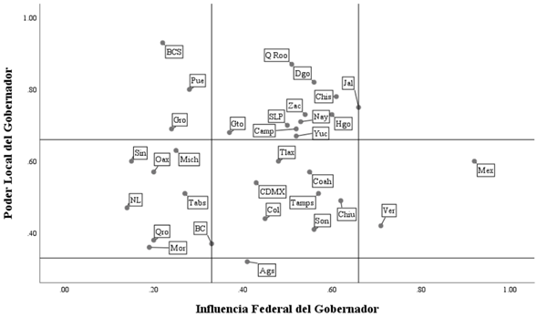 La construcción de las tipologías implica el cruce de datos de los subíndices mencionados en el apartado 2 de este texto, es decir, el IPG y las tipologías tienen como base los mismos componentes. No obstante, cada subíndice contempla solo dos componentes con una relación semántica específica, lo cual nos permite observar el poder de un gobernador en arenas específicas, por ejemplo, su poder a nivel local o su influencia a nivel federal.