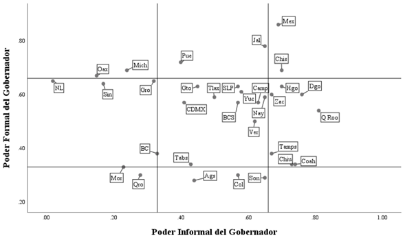 Esta tipología da prioridad a los contextos desde donde surgen las capacidades de los gobernadores; así, consideramos los subíndices de poder formal del gobernador (A+C) y de poder informal del gobernador (B+D). En esta tipología nos concentramos en diferenciar si el poder de los gobernadores está asentado en normas ya escritas o en aquellas que se dan por cuestiones informales, lo cual podemos observar de forma clara en la gráfica 3.